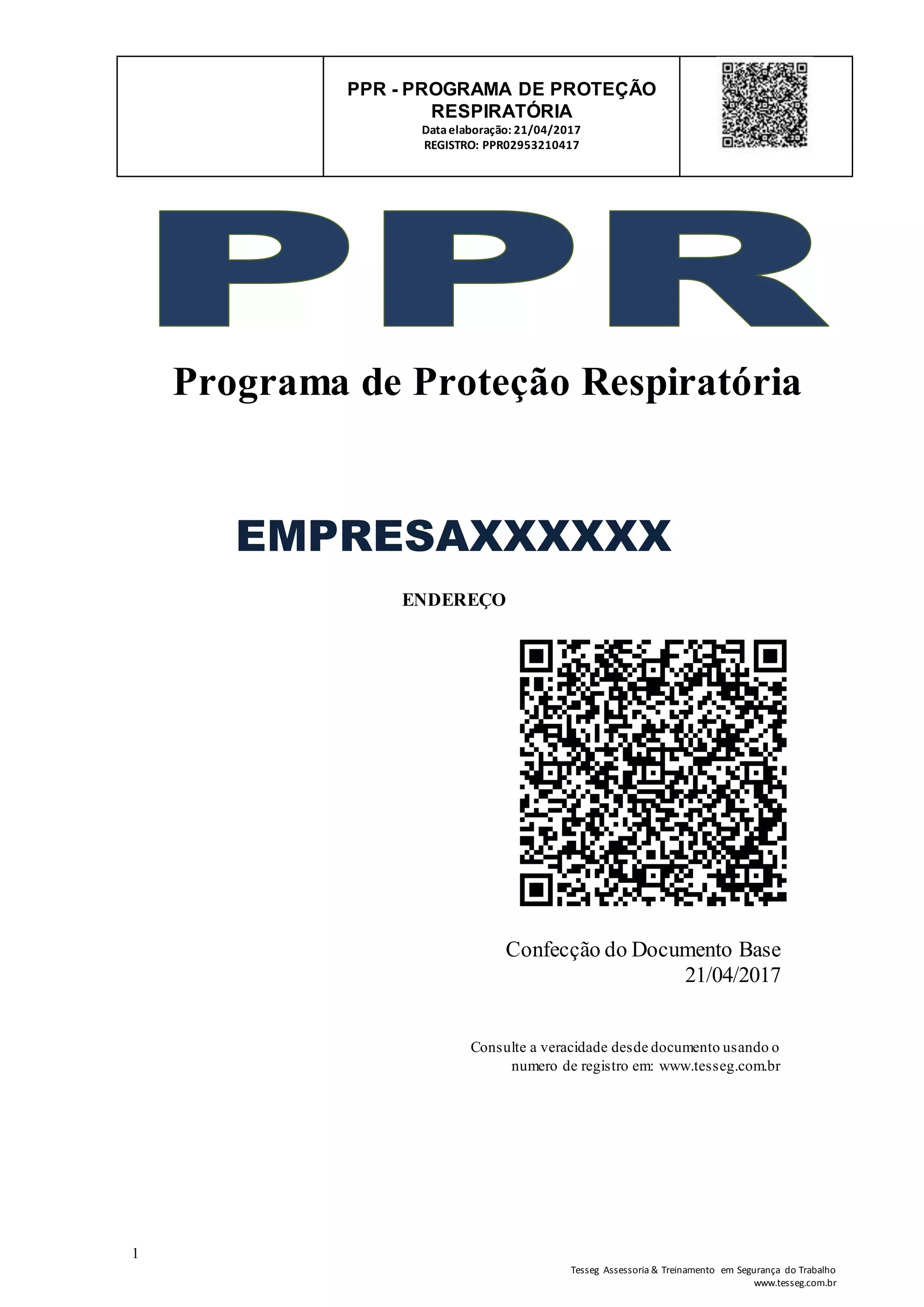 Este documento apresenta um Programa de Proteção Respiratória (PPR) para uma empresa de instalação e manutenção elétrica. O PPR descreve os procedimentos para avaliação de riscos respiratórios, seleção de equipamentos de proteção respiratória, treinamento de funcionários e monitoramento do programa. O objetivo é preservar a saúde dos trabalhadores ao antecipar, reconhecer, avaliar e controlar riscos ambientais no ambiente de trabalho.