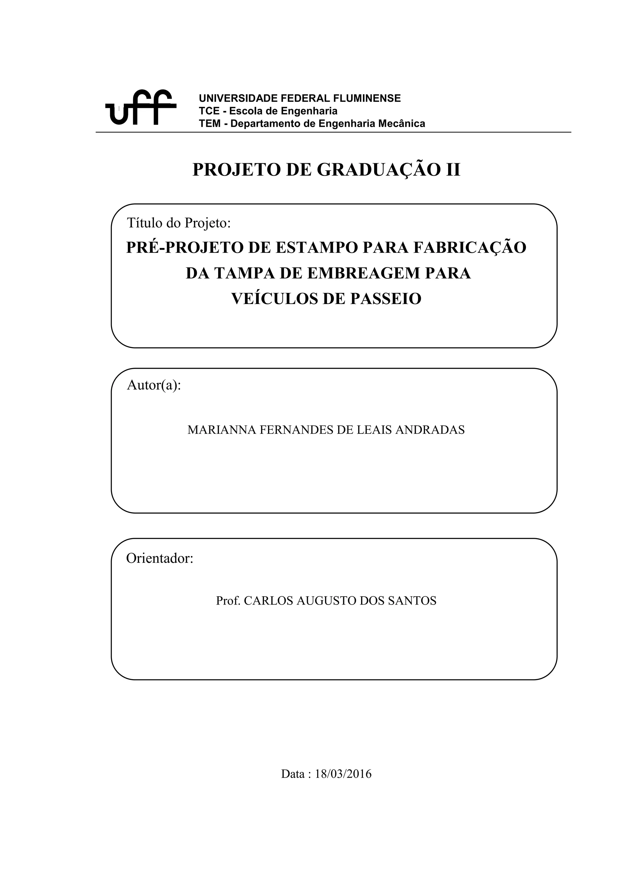 Este documento apresenta o pré-projeto dos estampos necessários para a fabricação da tampa da embreagem para veículos de passeio. Inicialmente, é feita uma revisão bibliográfica sobre o processo de estampagem e projeto de estampos. Em seguida, é descrita a metodologia utilizada para concepção e pré-projeto dos estampos. Por fim, são apresentados os resultados do pré-projeto, incluindo os cálculos e desenhos dos estampos de corte, furação A, embutimento e fura