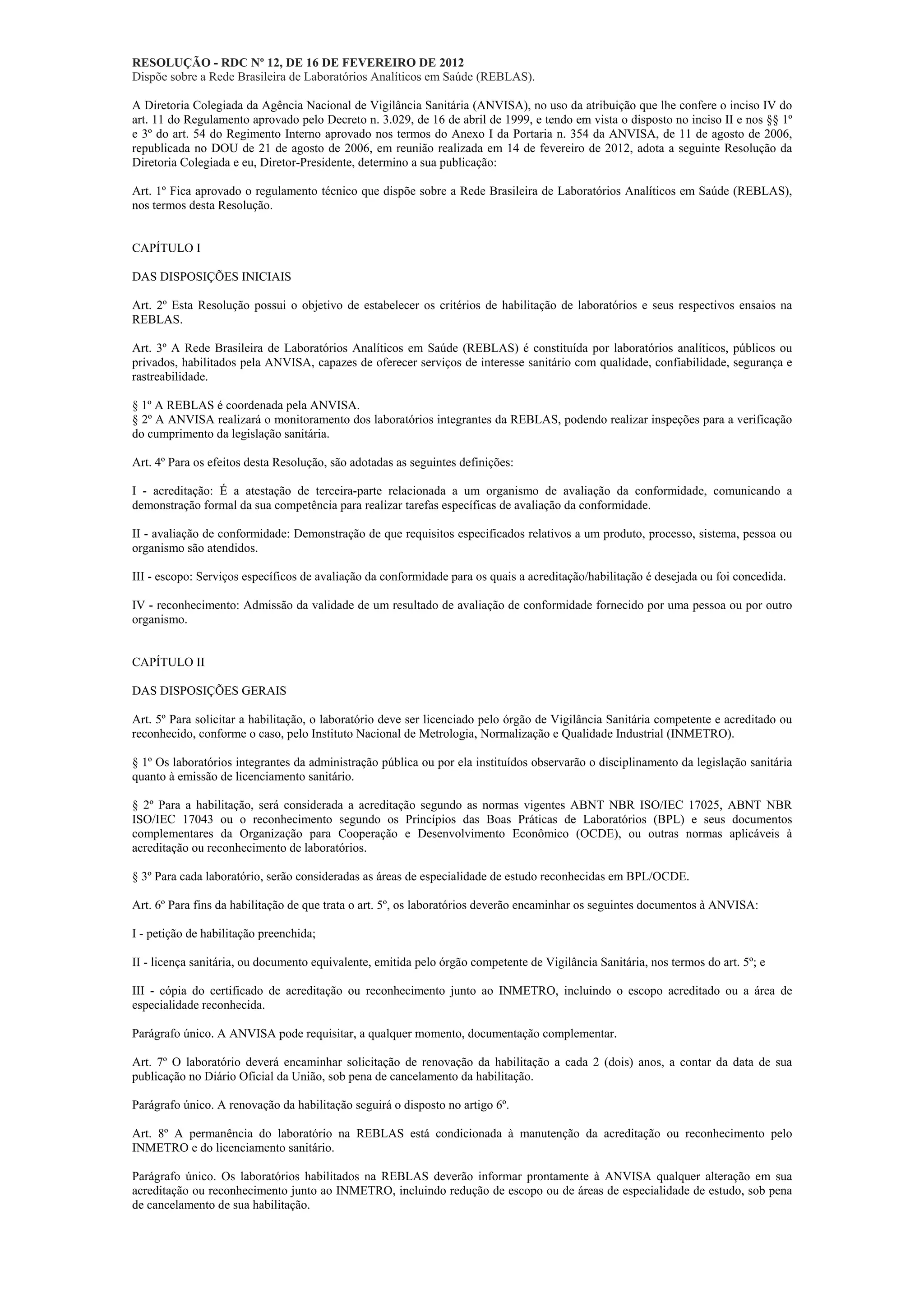 Esta resolução estabelece os critérios para habilitação de laboratórios na Rede Brasileira de Laboratórios Analíticos em Saúde (REBLAS), definindo que os laboratórios devem ser licenciados, acreditados ou reconhecidos e monitorados pela Agência Nacional de Vigilância Sanitária (ANVISA). Também define os procedimentos e prazos para laboratórios já integrantes da REBLAS manterem sua habilitação de acordo com os novos critérios.