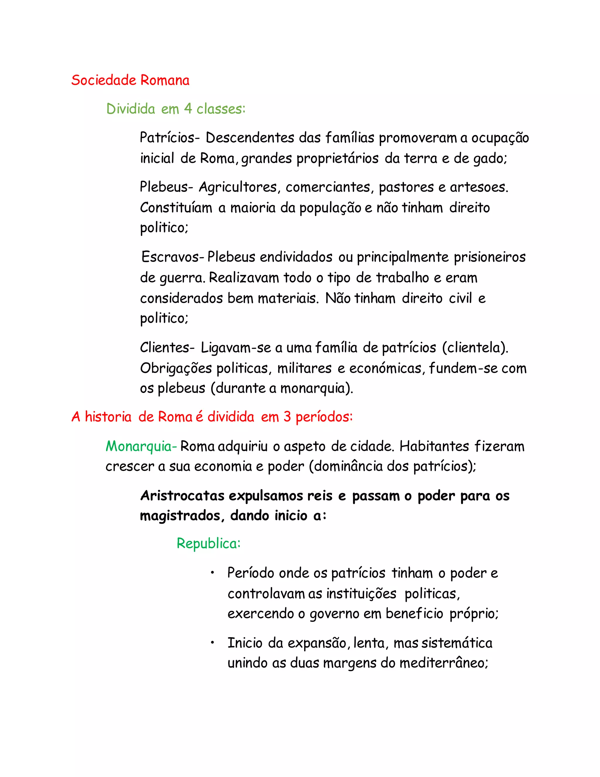 A sociedade romana era dividida em classes sociais, com os patrícios no topo e os escravos no fundo. A história de Roma é dividida em Monarquia, República e Império, períodos nos quais o poder político mudou de mãos. A expansão romana se deu por razões de segurança, interesse econômico e ambição política.
