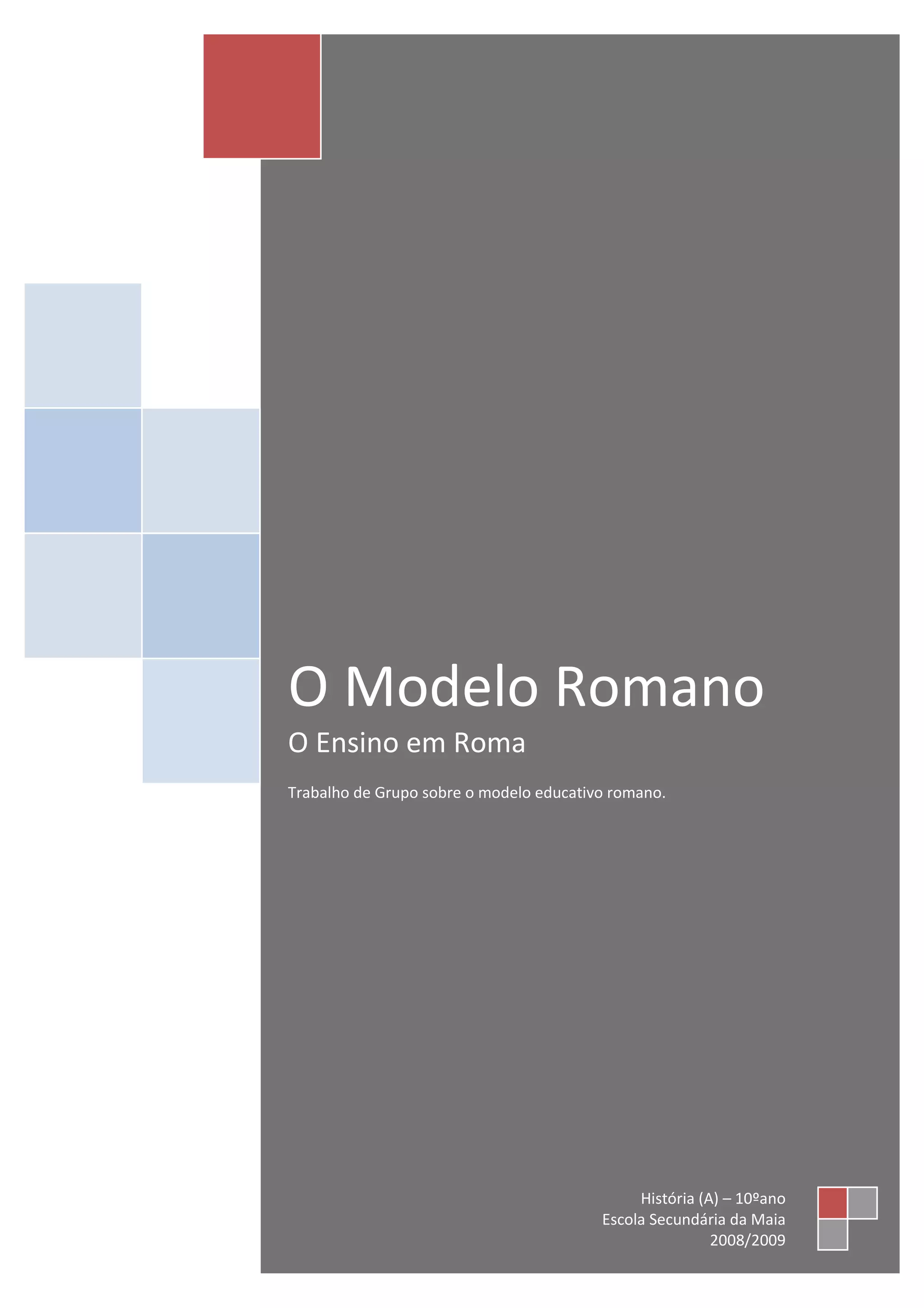 O documento descreve o modelo educativo romano, que adotou muitos aspectos do modelo grego, mas também apresentou algumas diferenças. Roma desenvolveu o primeiro sistema educacional organizado em três níveis - instrução primária, secundária e superior - com escolas espalhadas pelo império. A educação romana enfatizava mais a literatura do que a ciência, música ou atletismo.