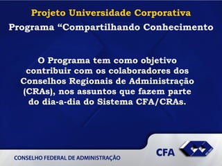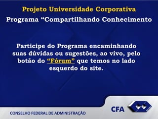 O projeto tem como objetivo contribuir com os colaboradores dos Conselhos Regionais de Administração compartilhando conhecimento sobre assuntos do dia-a-dia do sistema. Os participantes podem enviar dúvidas e sugestões ao vivo por meio de um fórum no site.