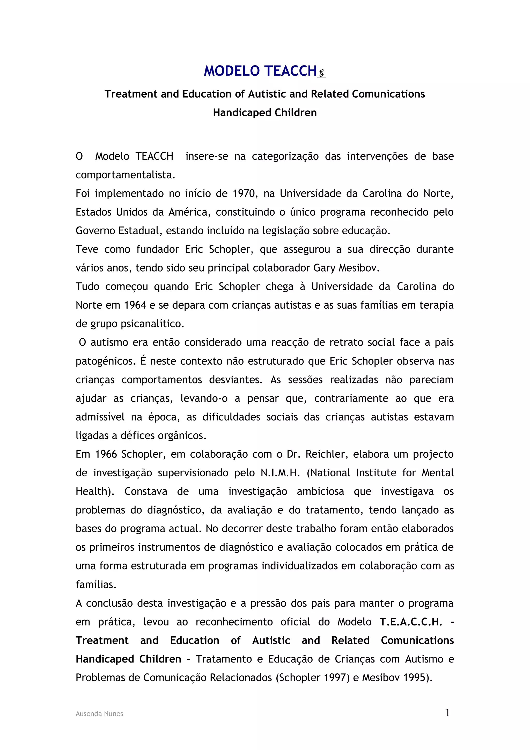 O documento descreve o Modelo TEACCH, um programa desenvolvido na década de 1970 para tratar crianças com autismo. O modelo enfatiza a estruturação do ambiente, rotinas visuais e organização do tempo para ajudar crianças com autismo a aprender e funcionar de forma independente. O modelo também busca envolver as famílias e promover a inclusão das crianças na comunidade.