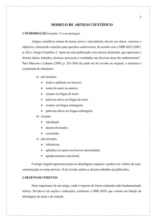Este documento fornece instruções sobre como estruturar um artigo científico de acordo com as normas da ABNT. Ele explica que um artigo científico deve ter seções como introdução, desenvolvimento e considerações finais, e fornecer detalhes sobre como formatar elementos como resumos, citações, tabelas e figuras.