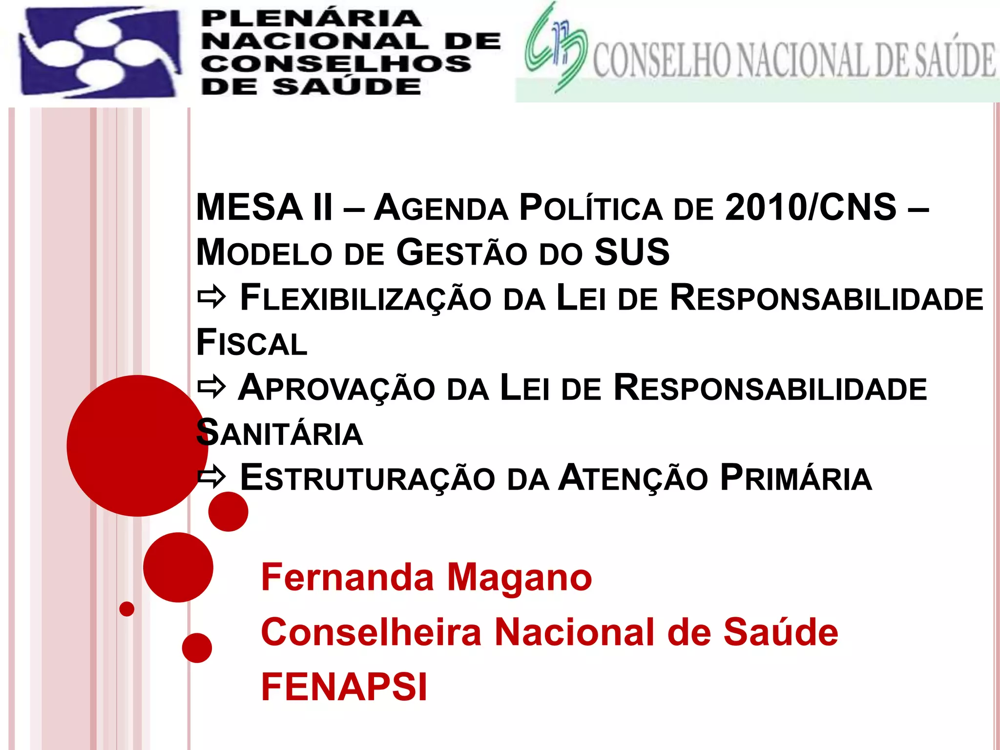 O documento discute a agenda política da CNS para 2010, propondo: 1) A flexibilização da Lei de Responsabilidade Fiscal para permitir mais contratações na área da saúde; 2) A aprovação de uma Lei de Responsabilidade Sanitária para definir obrigações administrativas na área da saúde; 3) A estruturação da Atenção Primária à Saúde.