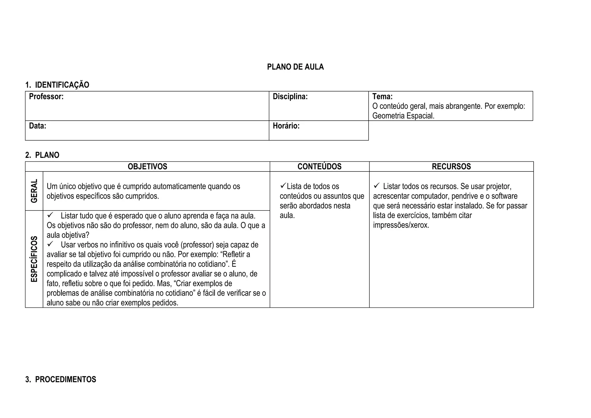Este plano de aula aborda um tema de geometria espacial. Ele inclui objetivos gerais e específicos, conteúdos, recursos, procedimentos para introdução, desenvolvimento e conclusão da aula, e avaliações qualitativas e quantitativas. O plano fornece detalhes sobre como o professor conduzirá a aula de modo a cumprir seus objetivos de ensino.