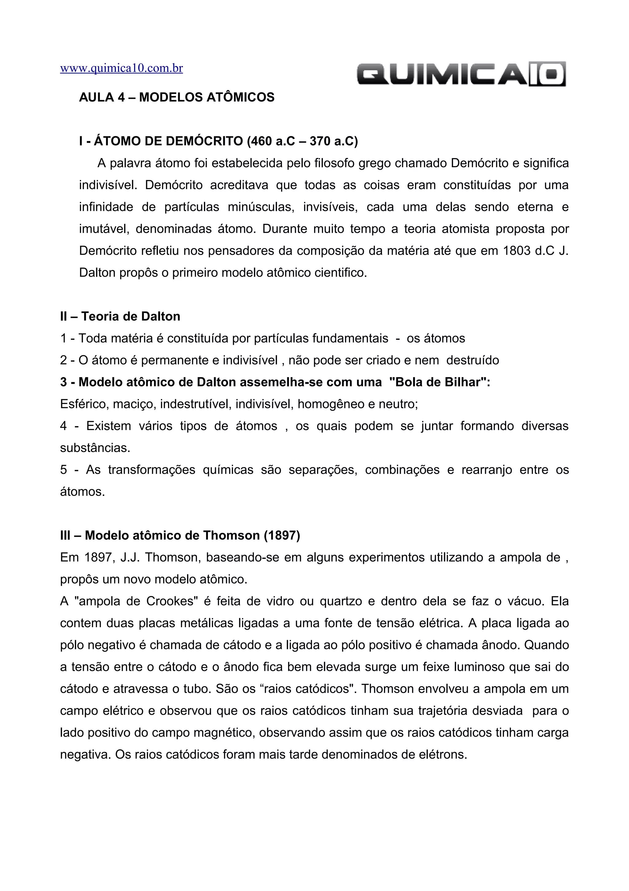 O documento descreve a evolução dos modelos atômicos, incluindo o modelo de Demócrito que via os átomos como indivisíveis, o modelo de Dalton de esferas maciças e indivisíveis, o modelo de Thomson de cargas positivas e negativas distribuídas, e o modelo nuclear de Rutherford com um núcleo denso rodeado por elétrons.