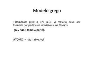 O documento descreve a evolução dos modelos atômicos ao longo do tempo, desde os filósofos gregos até os modelos atômicos modernos. Os principais modelos discutidos incluem: