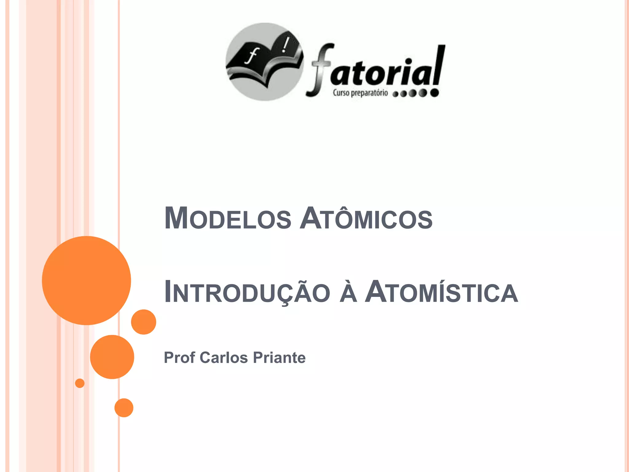 O documento discute os modelos atômicos ao longo da história, começando pelos modelos de Demócrito e Dalton que propuseram a existência de átomos indivisíveis. Posteriormente, os modelos de Thomson, Rutherford e Bohr tentaram explicar a estrutura do átomo com base em experimentos, propondo que o átomo consiste de um núcleo positivo rodeado por elétrons.