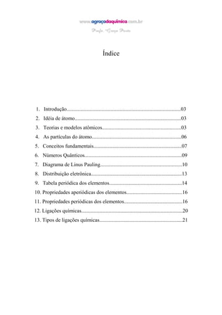 O documento apresenta um resumo sobre os principais conceitos da química, incluindo: (1) a evolução dos modelos atômicos ao longo do tempo, desde Dalton até o atual modelo planetário; (2) as partículas fundamentais do átomo - prótons, nêutrons e elétrons; e (3) números atômicos e de massa.