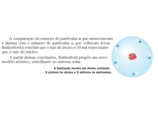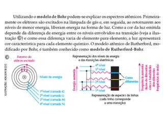 O documento descreve a evolução dos modelos atômicos ao longo do tempo, começando pelo modelo filosófico de Demócrito e chegando ao modelo quântico de Bohr. Os principais modelos descritos são o de Dalton, Thomson, Rutherford e Bohr.
