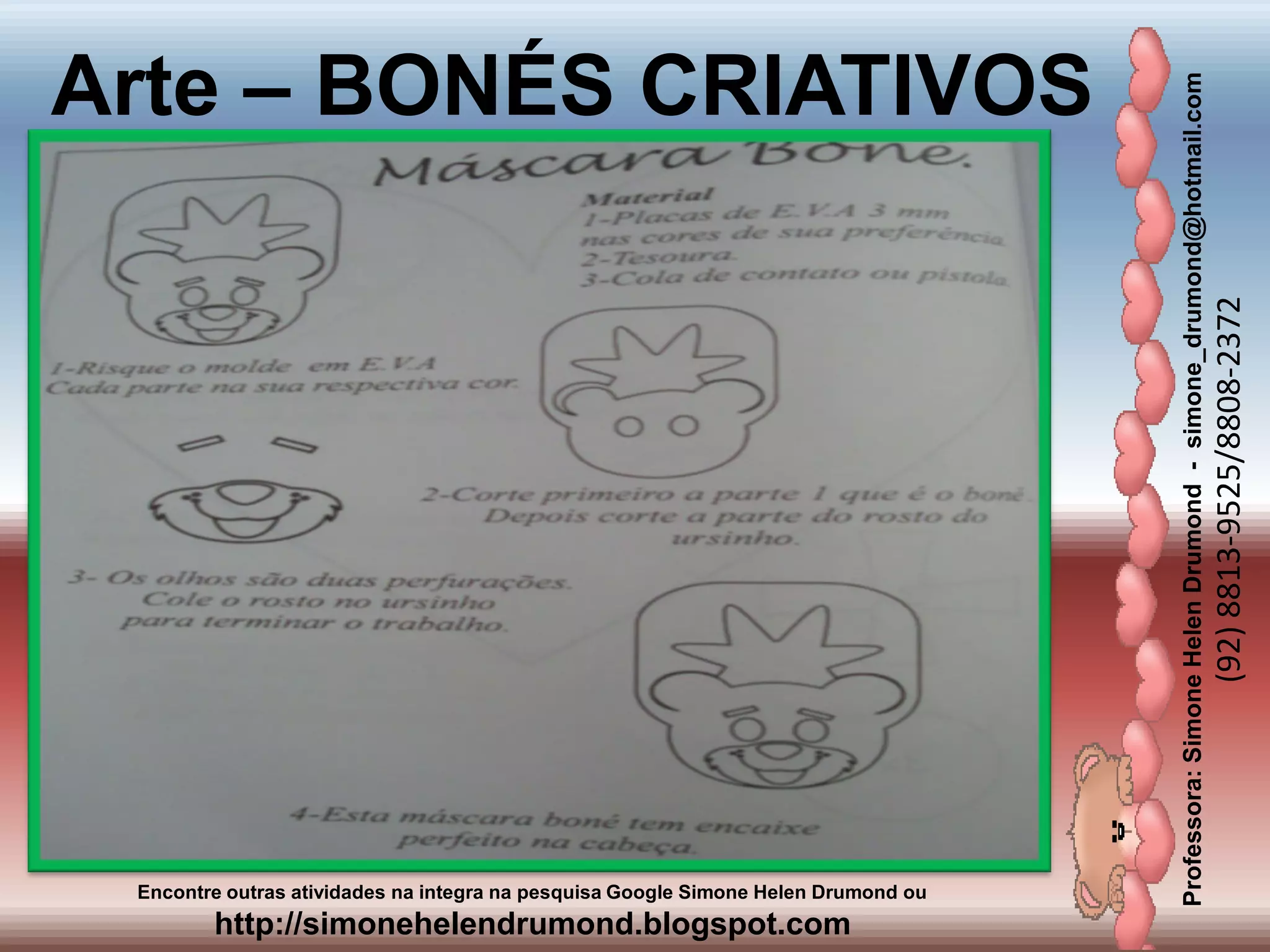 O documento fornece contato de uma professora e links para atividades criativas, incluindo modelos de bonés e chapéus decorados. A professora oferece seu email e telefone para contato e sugere pesquisar seu nome no Google ou visitar seu blog para encontrar outras atividades. Vários modelos de bonés e chapéus decorados são apresentados.