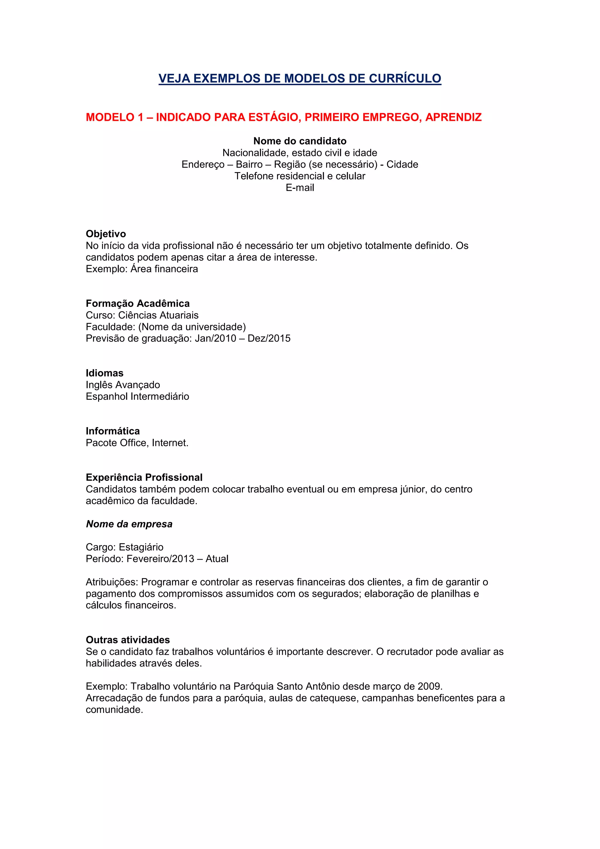 Os modelos de currículo apresentados fornecem exemplos para diferentes níveis profissionais: (1) estágio e primeiro emprego, (2) cargos operacionais, (3) vagas executivas. Eles incluem seções como objetivo, experiência, formação e idiomas, com ênfase em destacar qualificações e resultados relevantes para cada nível.