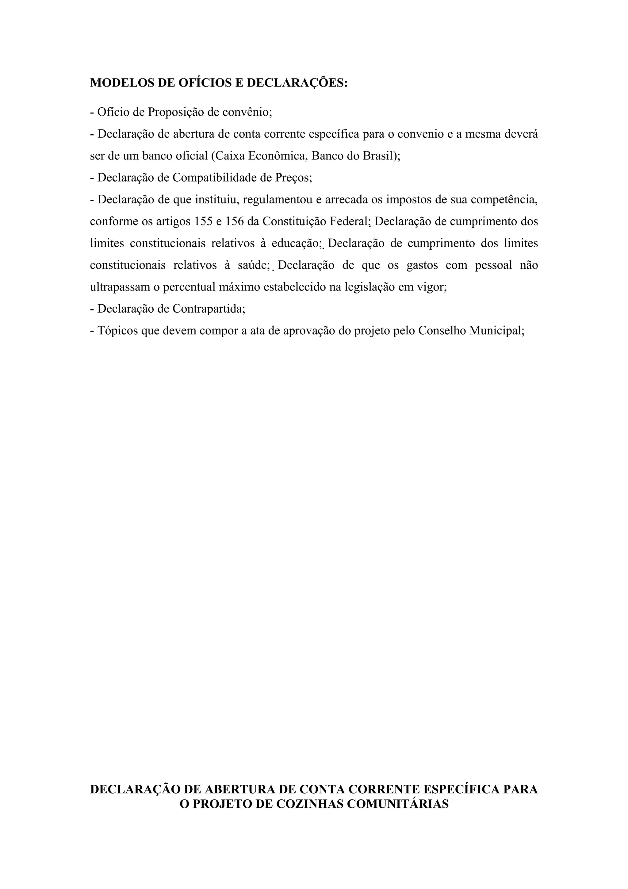 O documento fornece modelos de ofícios e declarações necessárias para propor um convênio, incluindo: declaração de abertura de conta corrente específica, declaração de compatibilidade de preços, declaração de cumprimento de limites constitucionais e gastos com pessoal, declaração de contrapartida, ofício de proposição do convênio e tópicos da ata de aprovação do projeto pelo conselho municipal.