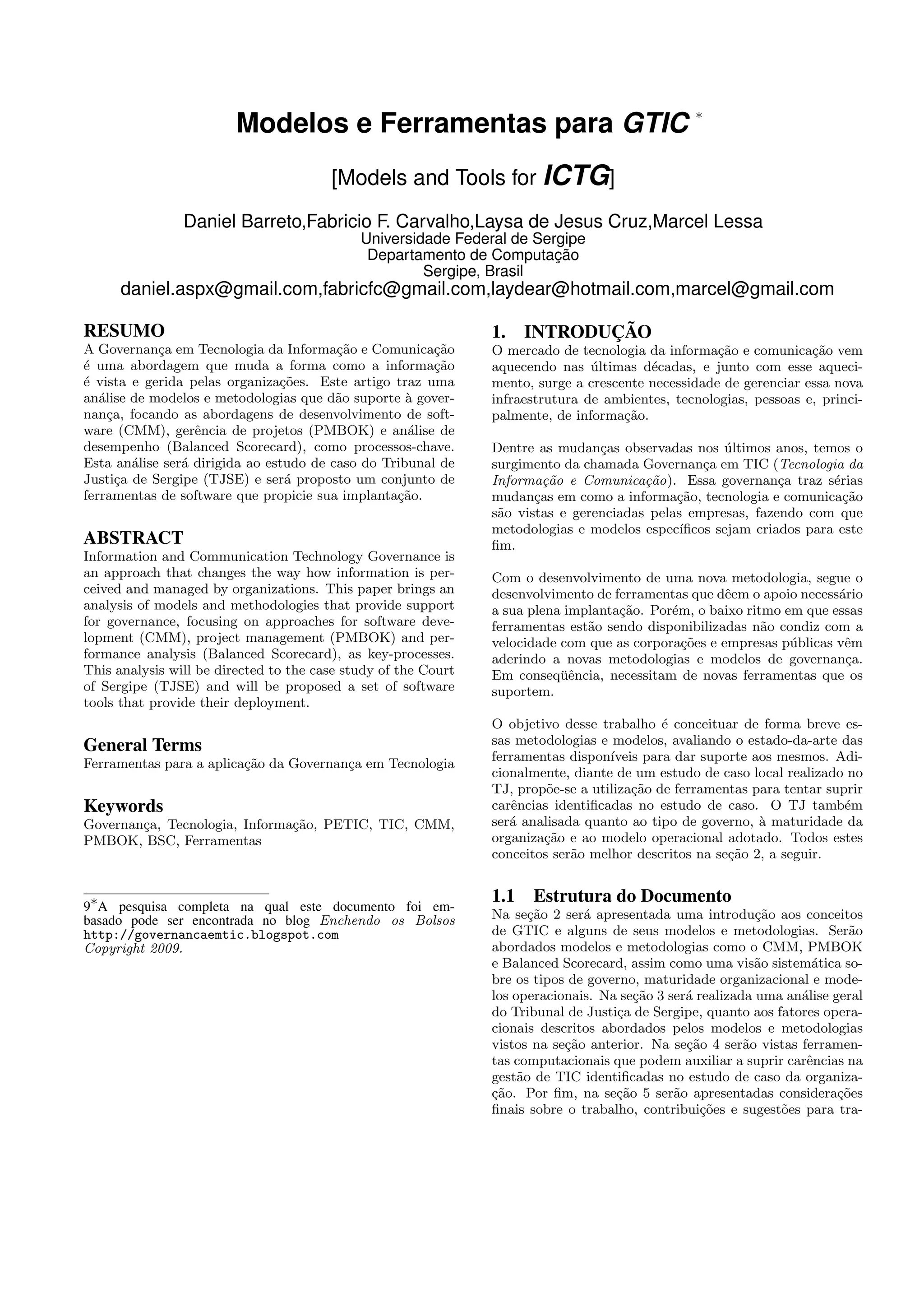 Este documento apresenta modelos e ferramentas para governança em Tecnologia da Informação e Comunicação (GTIC). Discute brevemente modelos como CMM, PMBOK e Balanced Scorecard, além de abordar tipos de governos, maturidade organizacional e modelos operacionais. O objetivo é conceituar essas metodologias e avaliar ferramentas disponíveis, propondo novas ferramentas para um estudo de caso no Tribunal de Justiça de Sergipe.