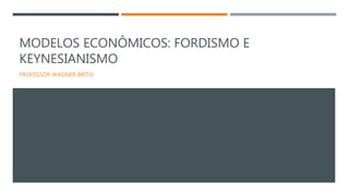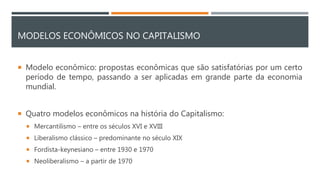 O documento descreve dois modelos econômicos importantes na história do capitalismo: o Fordismo e o Keynesianismo. O modelo Fordista pregava a produção em massa com consumo em massa através da esteira rolante. Já o modelo Keynesianismo defendia a intervenção estatal na economia por meio de investimentos públicos e controle monetário para criar empregos. Esses modelos predominaram entre 1930 e 1970, mas entraram em crise devido à necessidade constante de investimento e pressão por menores impostos.