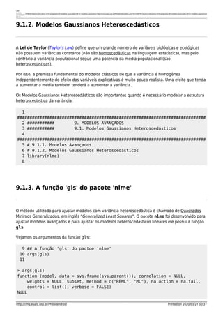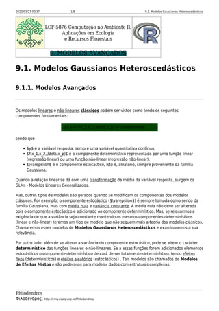 O documento discute modelos gaussianos heteroscedásticos, que são usados para modelar dados com variâncias não constantes, desafiando a premissa de modelos clássicos que assumem variância homogênea. Além de descrever a teoria, apresenta exemplos práticos de ajuste de modelos utilizando funções específicas do pacote 'nlme' em R, como 'gls' e 'gnls'. Os resultados demonstram que, embora os modelos heteroscedásticos sejam mais plausíveis estatisticamente, as diferenças nas predições em relação aos modelos tradicionais podem ser mínimas.