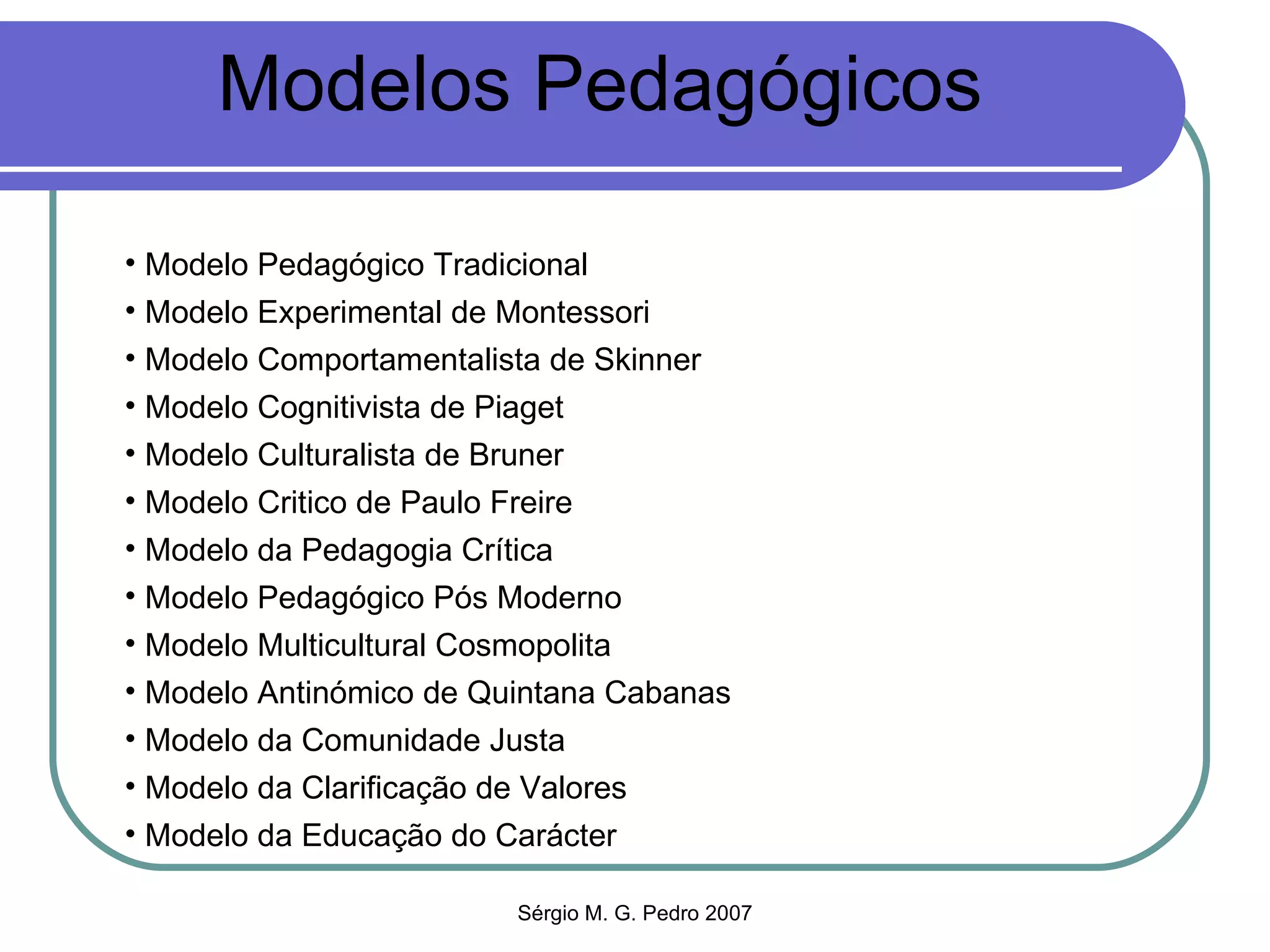 O documento descreve vários modelos pedagógicos, incluindo o modelo tradicional, o modelo de Montessori, o modelo comportamentalista de Skinner, o modelo cognitivista de Piaget, o modelo culturalista de Bruner, o modelo crítico de Paulo Freire, o modelo da pedagogia crítica, o modelo pós-moderno, o modelo multicultural cosmopolita e o modelo antinómico de Quintana Cabanas. Resume brevemente os princípios e pressupostos de cada modelo.