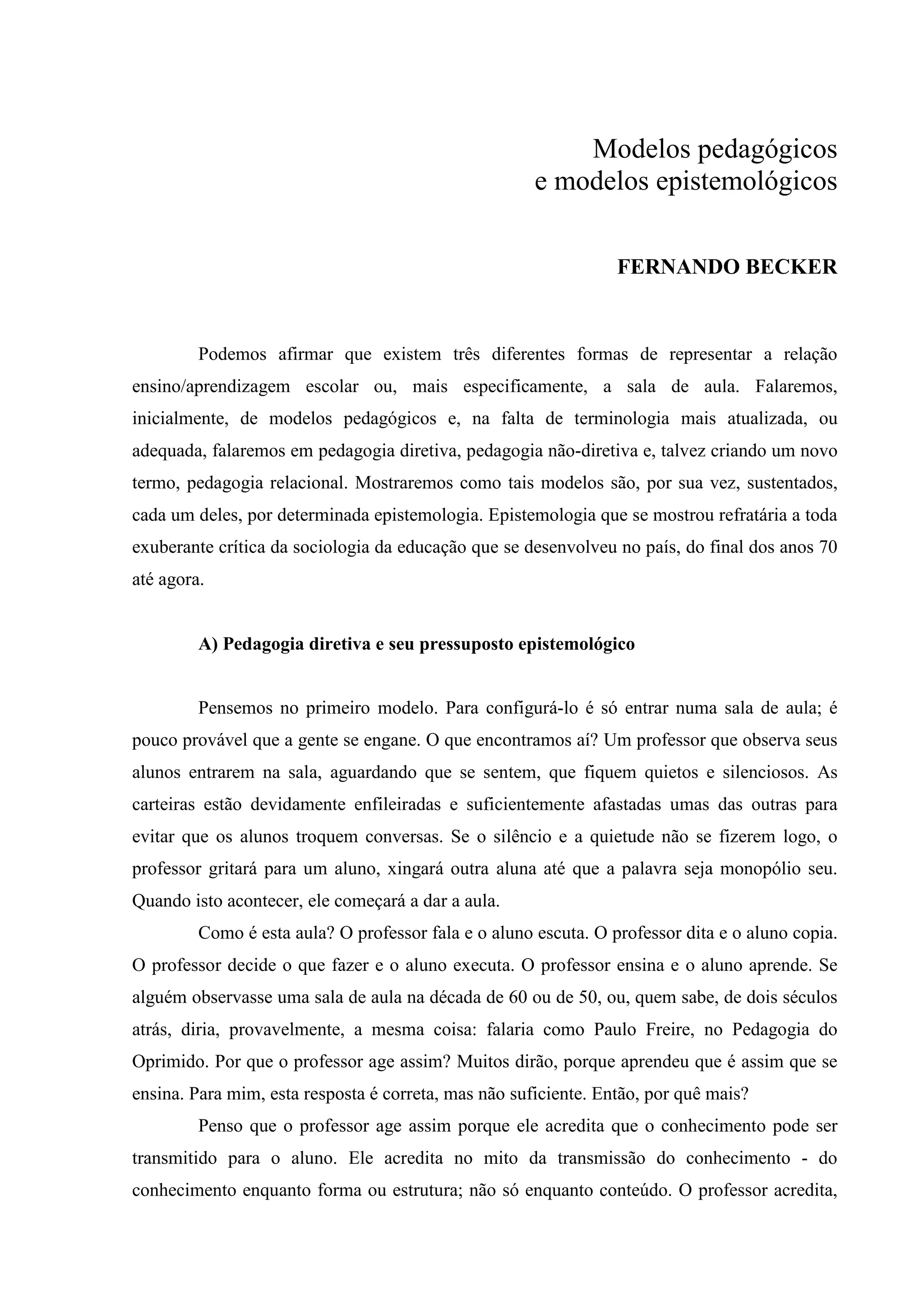 O documento discute três modelos pedagógicos e seus pressupostos epistemológicos: 1) A pedagogia diretiva é fundamentada no empirismo, onde o professor transmite conhecimento ao aluno como uma "tabula rasa"; 2) A pedagogia não-diretiva baseia-se no apriorismo, onde o aluno aprende por si só com base em conhecimento inato; 3) Uma terceira abordagem relacional é proposta, mas não detalhada.
