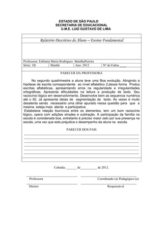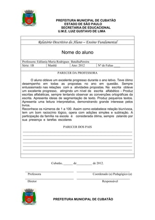 O documento é um relatório descritivo de vários alunos da 1a série do ensino fundamental. Contém os pareceres da professora sobre o progresso de cada aluno em leitura, escrita e matemática ao longo do ano letivo, assim como observações sobre a participação da família.