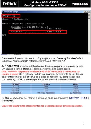 Este documento fornece instruções passo-a-passo para configurar um roteador D-Link DSL-2730B em modo roteador para fornecer acesso à Internet. Ele explica como encontrar o endereço IP do roteador, fazer login na interface web e configurar parâmetros como VPI, VCI, nome de usuário e senha PPPoE fornecidos pelo provedor de serviços de Internet.