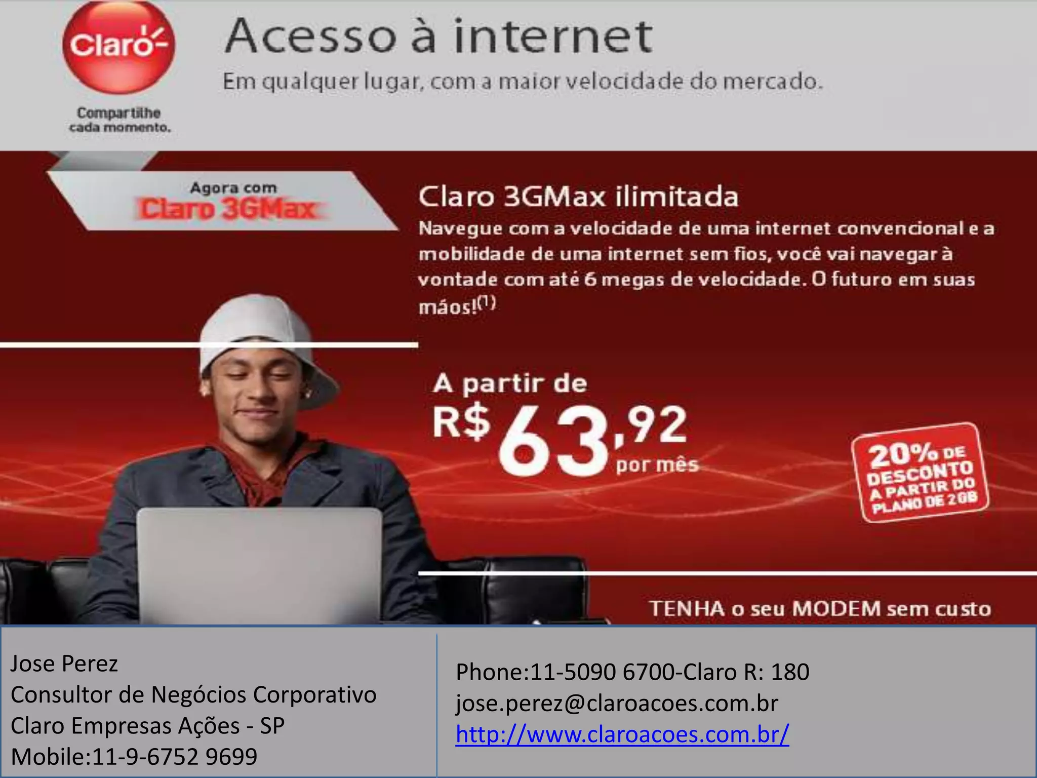 Jose Perez é um consultor de negócios corporativos da Claro Empresas Ações em São Paulo, Brasil. Ele pode ser contatado por telefone fixo, celular ou e-mail para fornecer serviços de consultoria de negócios às empresas. Seu site contém mais informações sobre a Claro Empresas Ações.