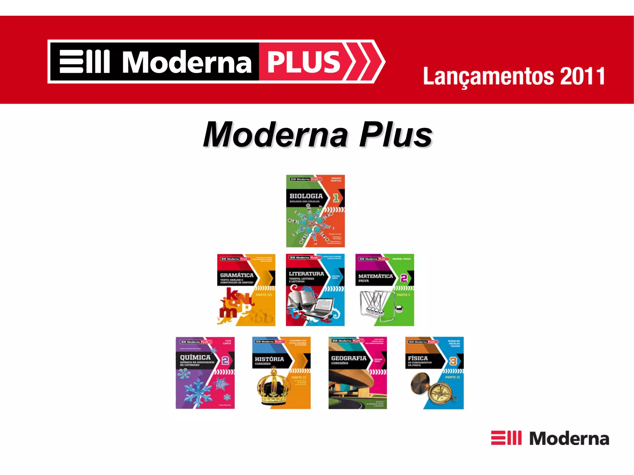 O documento descreve a estrutura do material didático Moderna Plus, que inclui livros texto, caderno do estudante, suplementos de revisão e portal. O livro texto é dividido em unidades temáticas com recursos visuais para complementar o aprendizado. O caderno do estudante ajuda na fixação dos termos e conceitos, além de propor atividades. O portal oferece conteúdos digitais adicionais.