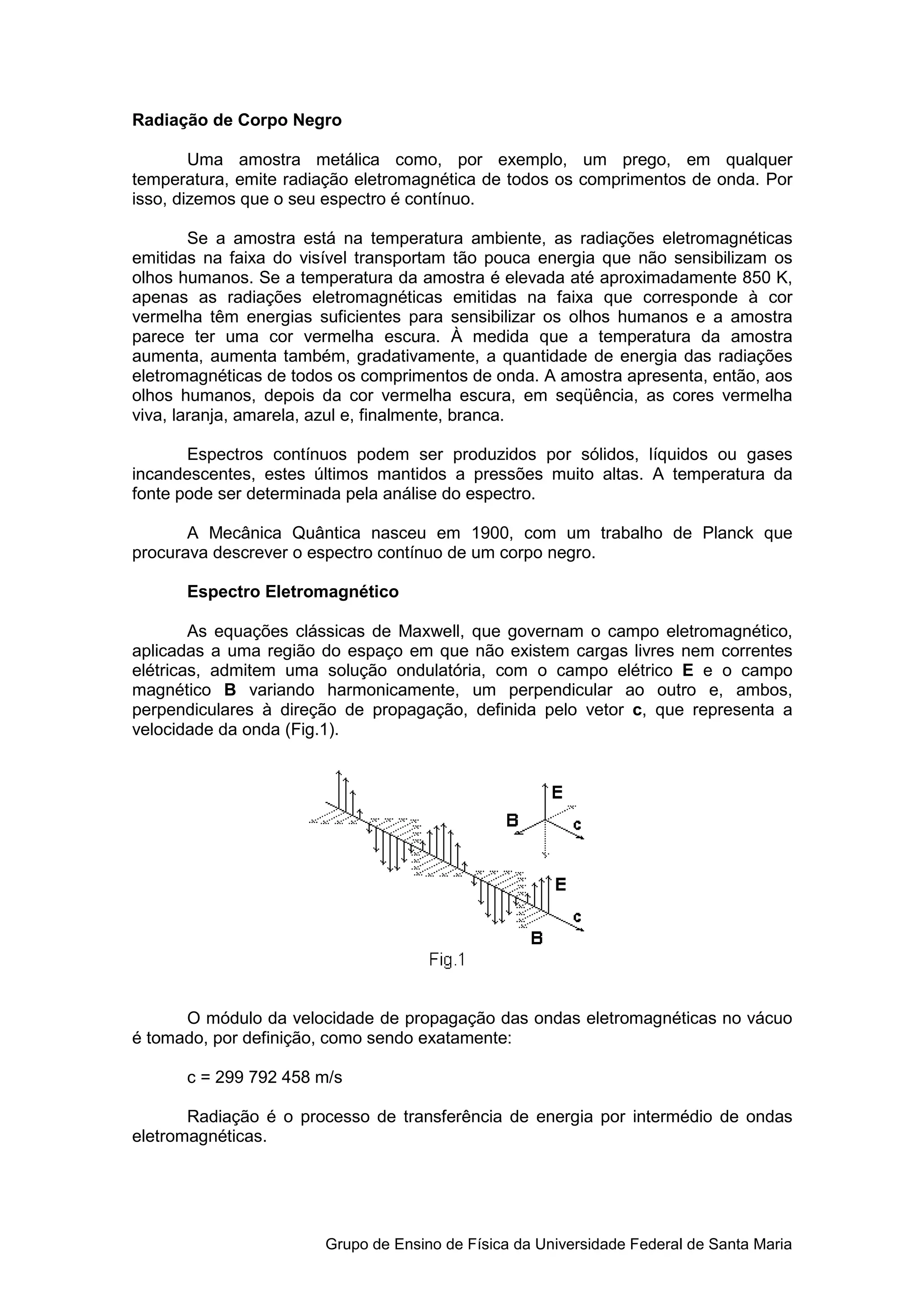 1) O documento discute o espectro contínuo da radiação emitida por corpos em diferentes temperaturas, conhecida como radiação de corpo negro.