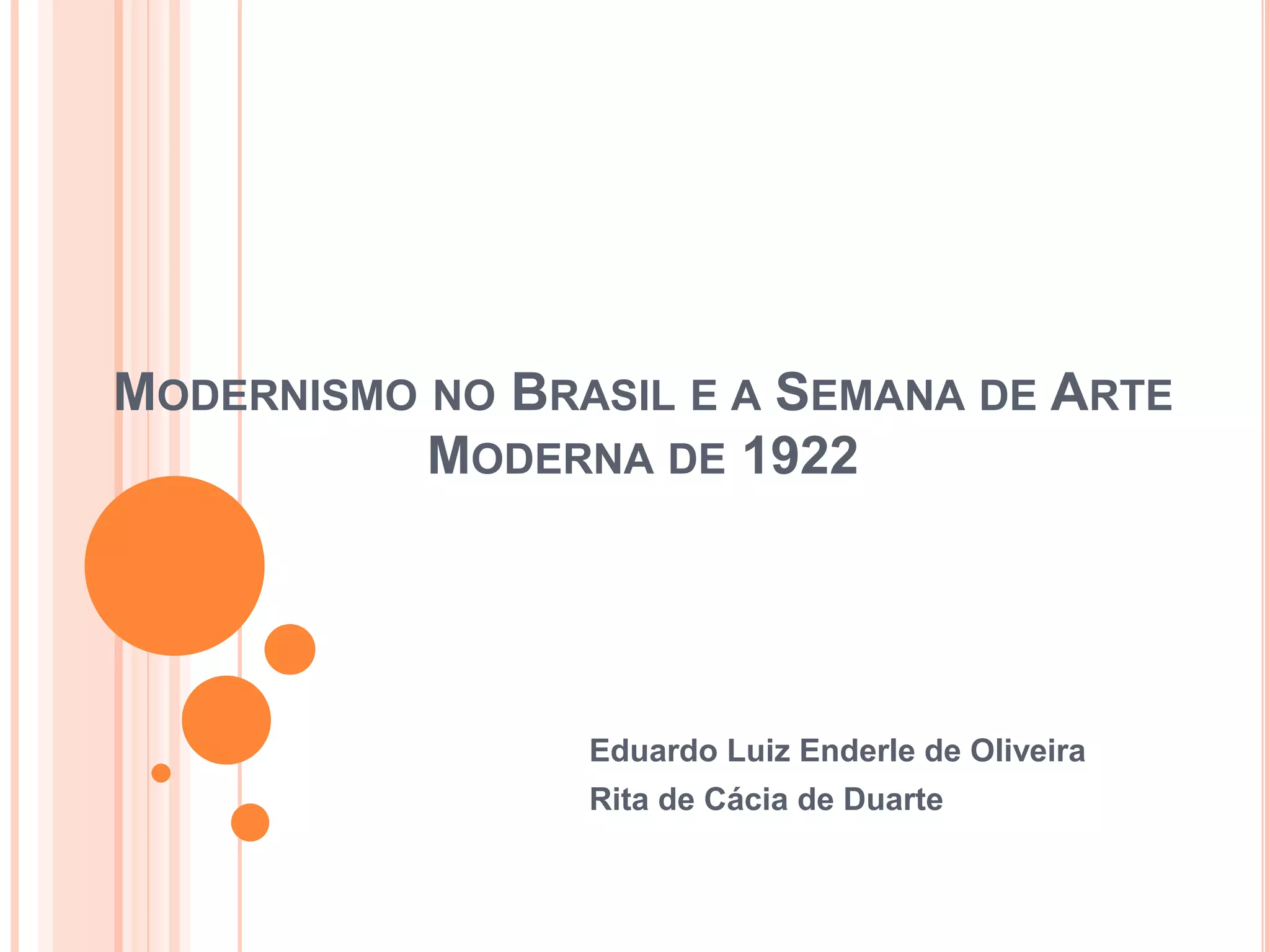 O documento descreve o modernismo no Brasil e a Semana de Arte Moderna de 1922, que marcou o início do movimento no país. Apresenta as características do modernismo e como ele foi assimilado no contexto artístico brasileiro com foco em elementos da cultura nacional. Divide a história do modernismo brasileiro em três fases, desde a década de 1920 até o período pós-1945.