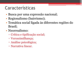 Este documento descreve o movimento modernista brasileiro da década de 1930, conhecido como Geração de 30. Ele apresenta as principais características do romance regionalista dessa fase modernista, como a busca por uma expressão nacional e o retrato das diferentes regiões do Brasil. Também destaca os principais autores desse período, como José Lins do Rego, Jorge Amado e Graciliano Ramos, e suas obras mais representativas.