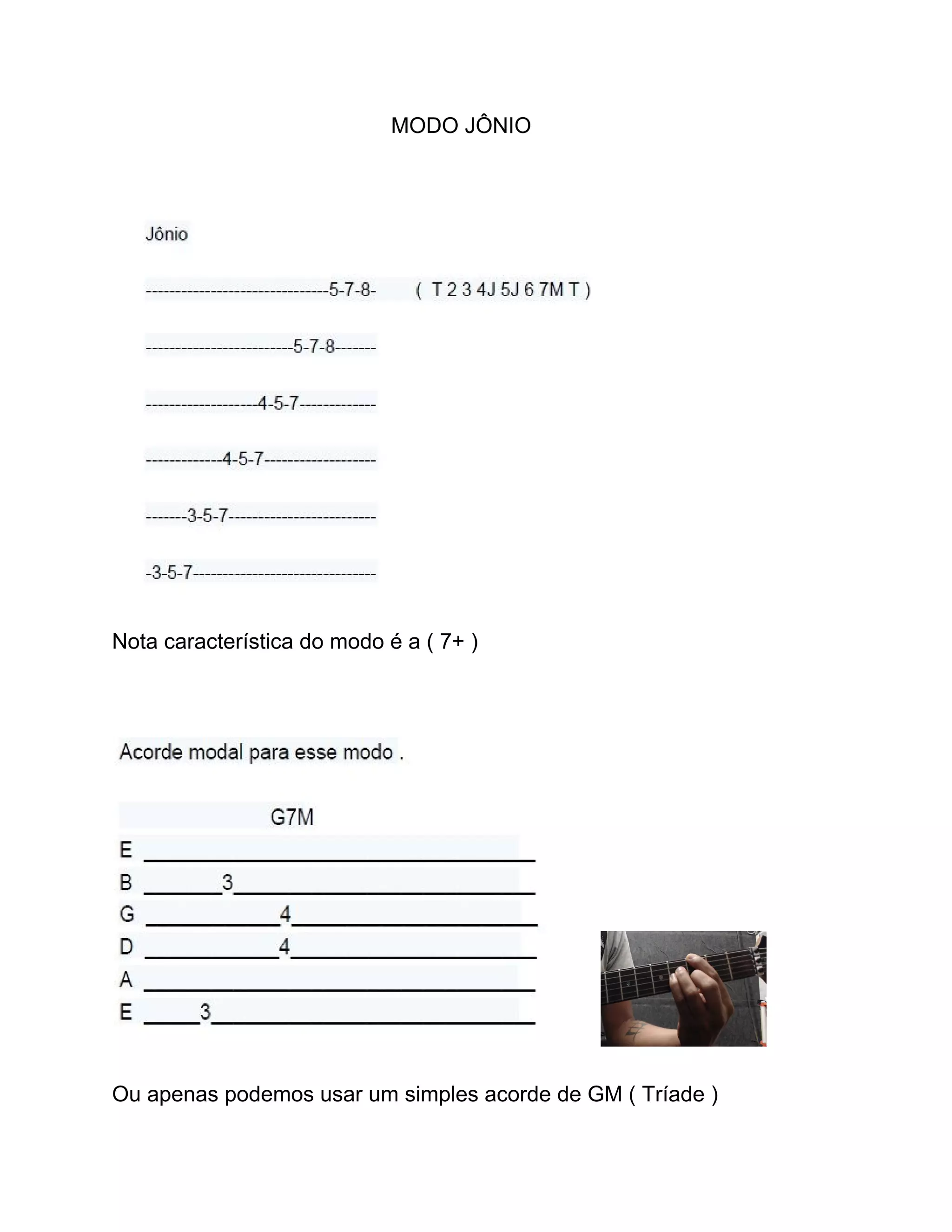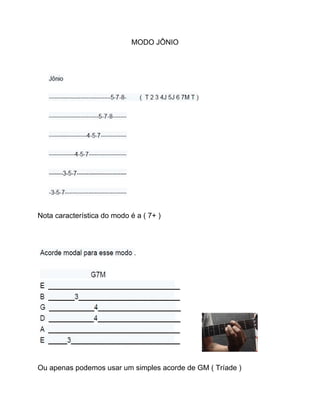 O modo jônio ou escala maior é caracterizado pela nota sensível aumentada em um semitom acima da tônica. Recomenda-se evitar o quarto grau por gerar dissonância com a terceira, usando-o apenas como nota de passagem. Arpejos sobre o modo jônio podem partir da tônica, terceira, quinta ou sétima, gerando acordes de G7M, Bm7, D7 ou F#m7 5b respectivamente.