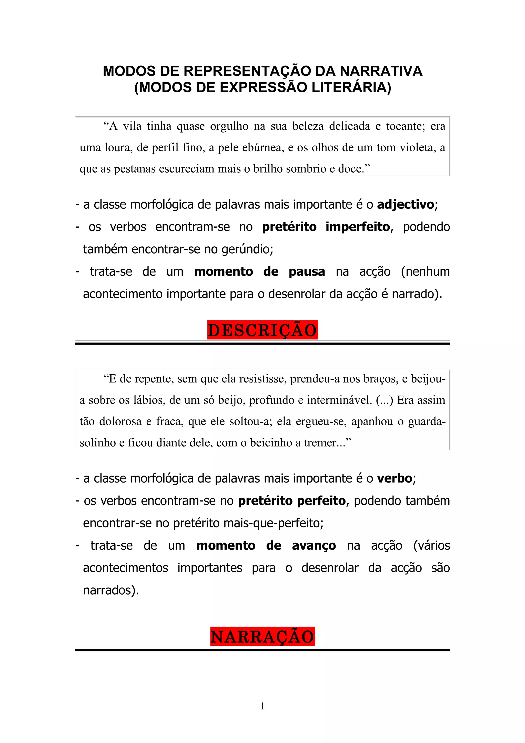 O documento resume três modos de representação narrativa - descrição, narrativa e diálogo. A descrição se caracteriza por verbos no pretérito perfeito e enfatiza ações. A narrativa apresenta diálogo entre personagens. O diálogo é identificado pelos dois-pontos e travessão entre falas. O monólogo representa pensamentos internos sem interação.