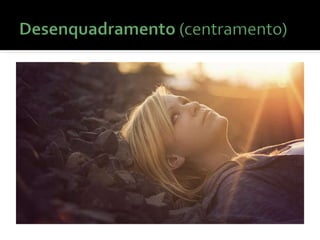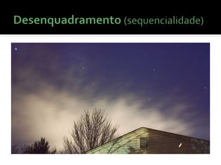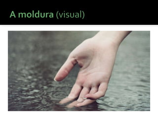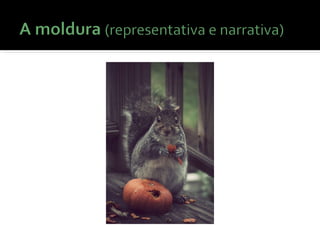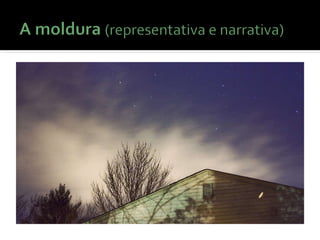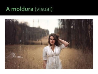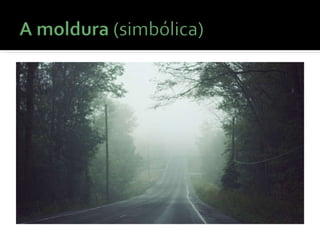 O documento discute três tópicos principais: 1) as definições de espaço plástico, visão objetiva, subjetiva e relativa; 2) as funções da moldura de uma imagem como separar, significar valor e profetizar um discurso; 3) a noção de enquadramento como um campo visual centrado ou descentrado e as variações como centramento, borda e sequencialidade.