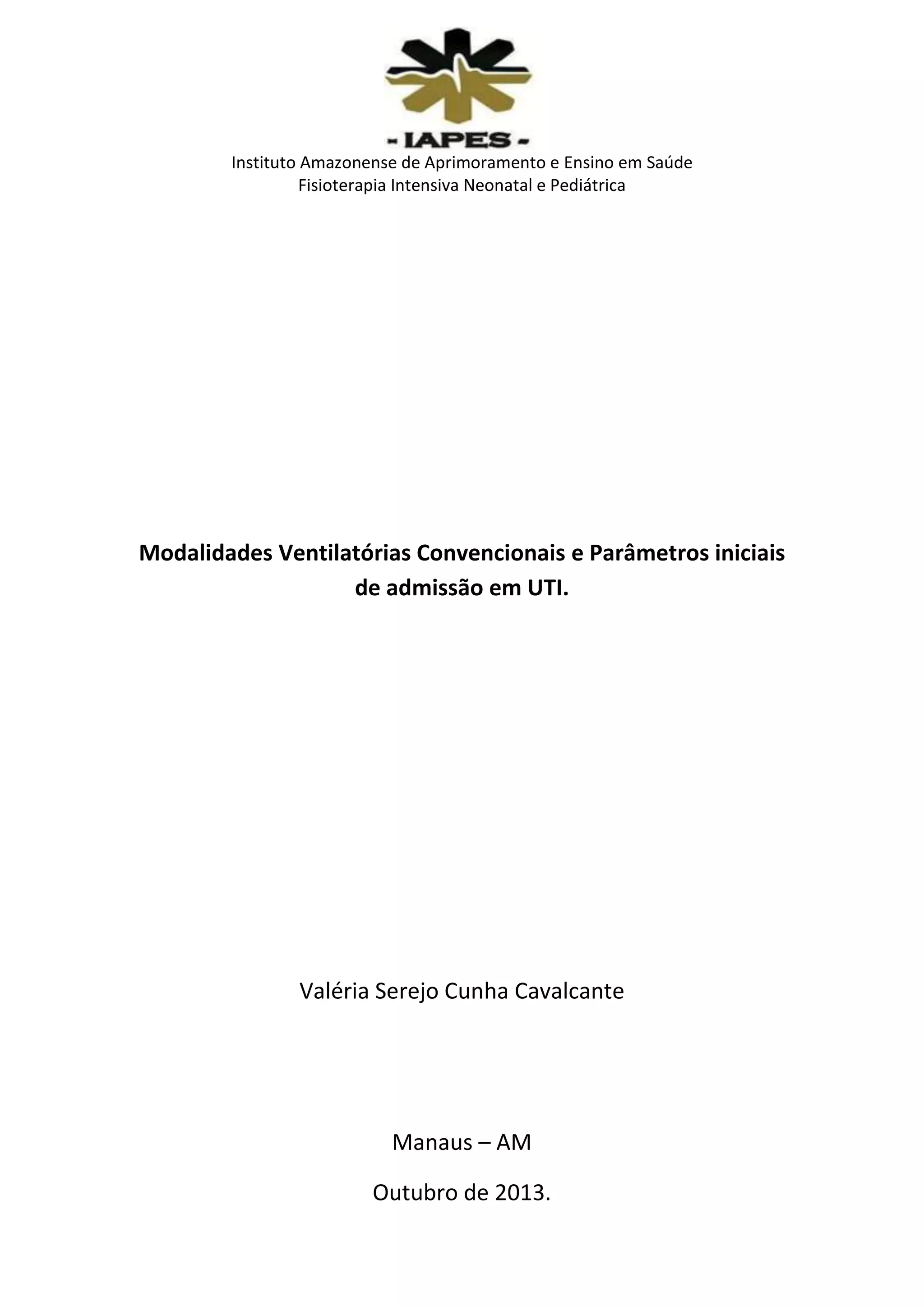 1) O documento discute as modalidades ventilatórias convencionais utilizadas em Unidades de Terapia Intensiva e os parâmetros iniciais de ajuste quando um paciente é admitido, incluindo modos como VCV, PCV, PSV e SIMV.