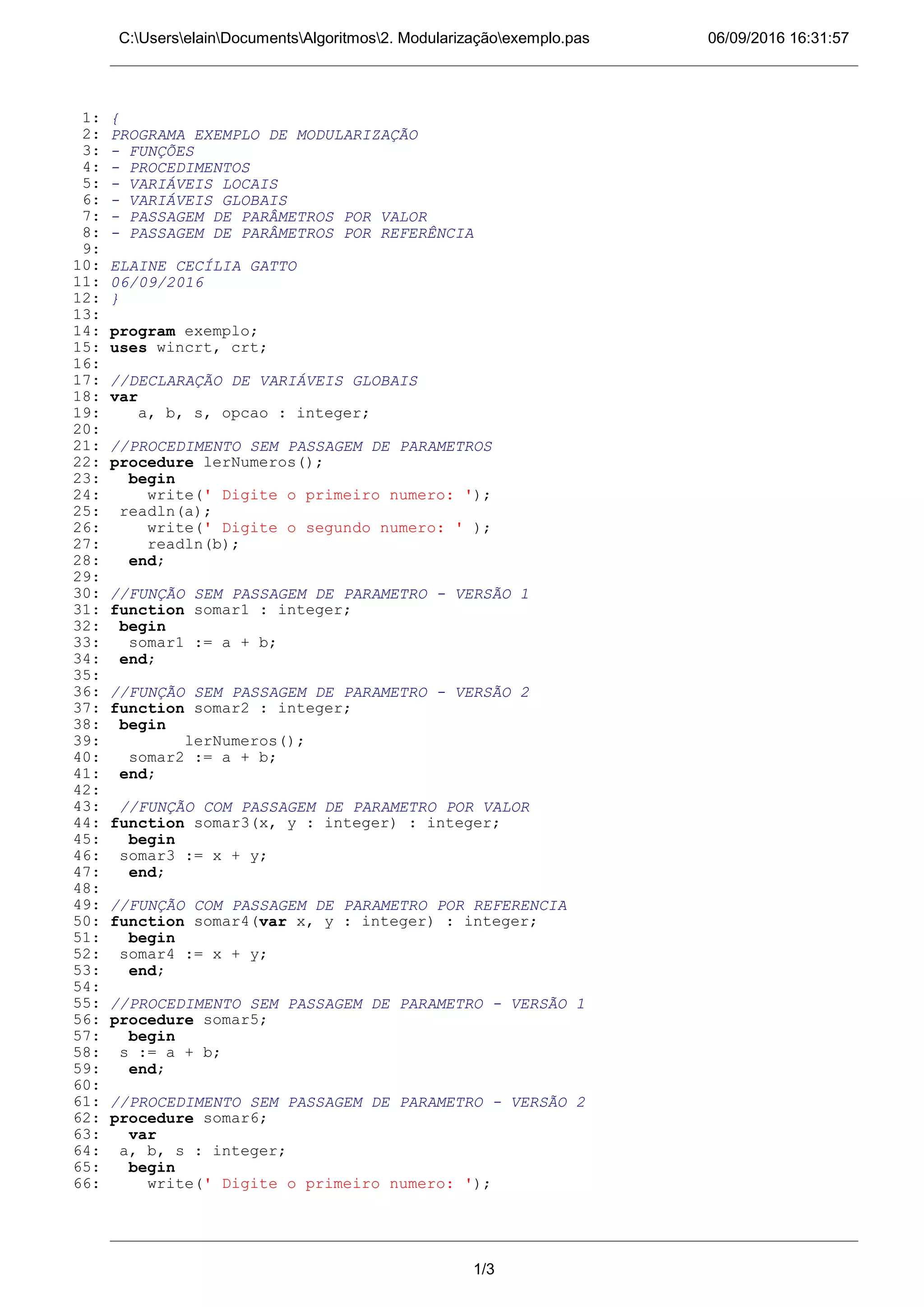 O documento apresenta um programa em Pascal que exemplifica a modularização através de funções e procedimentos, incluindo passagem de parâmetros por valor e referência. O programa principal oferece um menu de opções para testar cada função/procedimento.