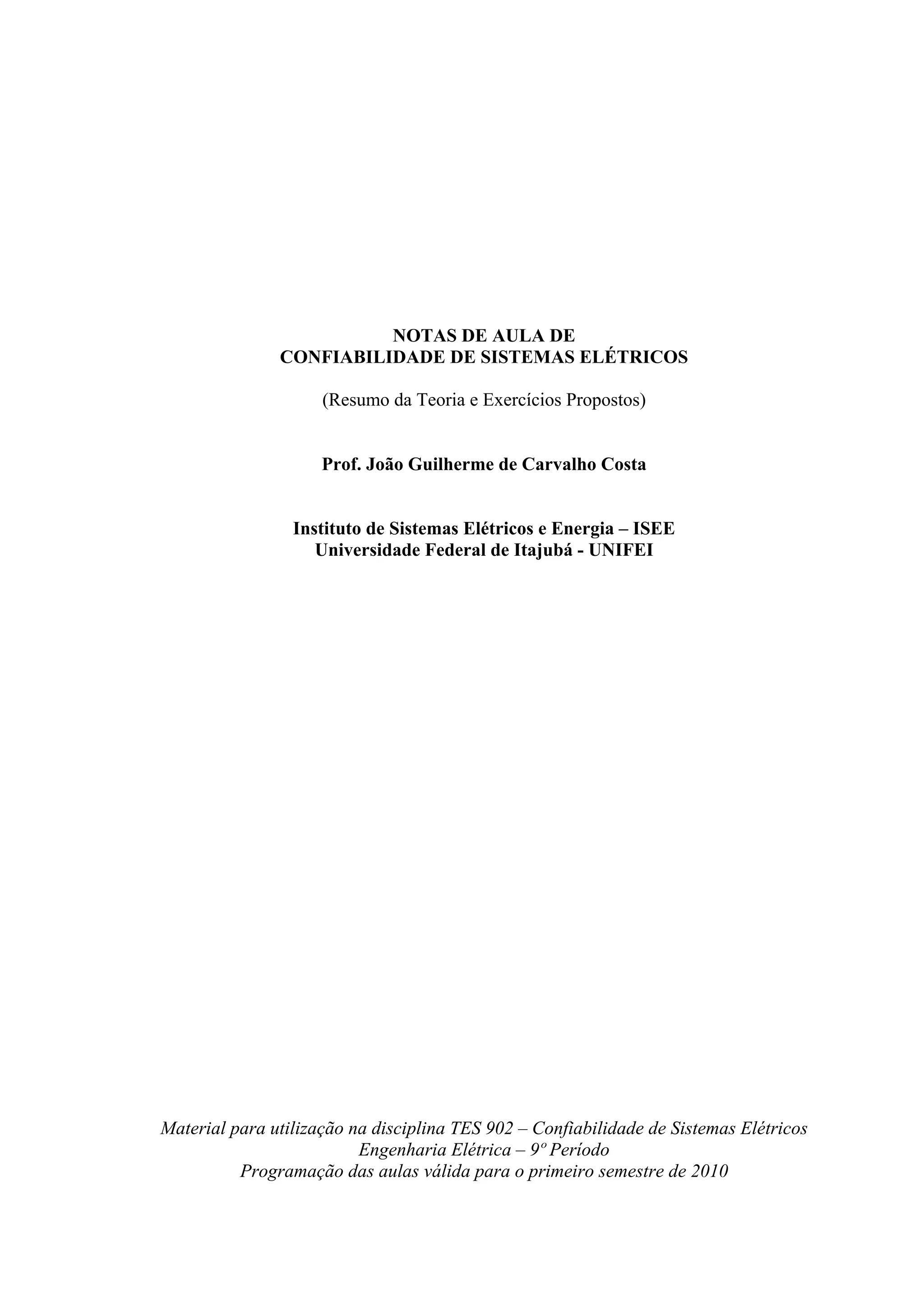 Este documento apresenta o plano de aula para a disciplina de Confiabilidade de Sistemas Elétricos ministrada no primeiro semestre de 2010. O plano inclui nove módulos sobre teoria da confiabilidade e modelagem de sistemas, duas provas, um exame final e a programação das aulas ao longo do semestre.