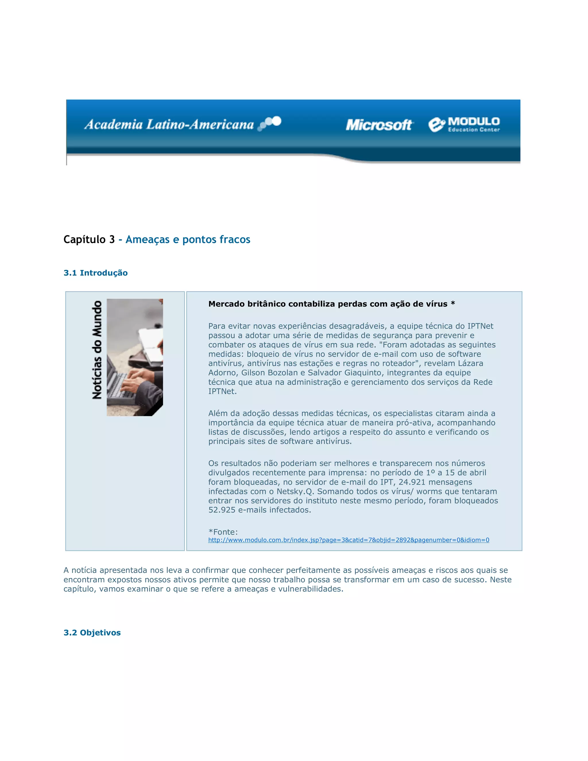 1. O documento discute as ameaças e vulnerabilidades às informações das empresas, identificando os principais tipos de ameaças como vírus, divulgação de senhas e hackers. 2. As vulnerabilidades incluem fatores físicos, de hardware, software e operacionais que podem permitir a concretização das ameaças, comprometendo a confidencialidade, disponibilidade e integridade das informações. 3. Uma pesquisa mostra que os principais riscos identificados nas empresas brasileiras são vírus, divulgação de
