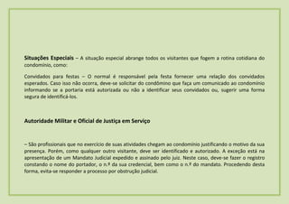 1) Convidados para festas devem ter uma lista fornecida pelo responsável ou o condômino deve informar a portaria sobre como identificá-los.