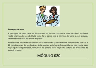 A passagem de turno entre funcionários deve ser feita através do livro de ocorrência, onde o funcionário que está saindo fará um breve relato da situação e ambos assinarão. O funcionário que está entrando deve chegar com antecedência uniformizado para analisar as informações passadas e inspecionar a área antes de assumir o posto.