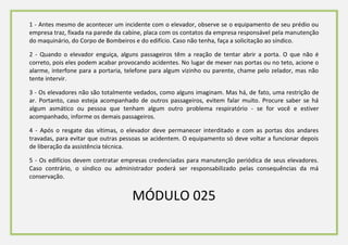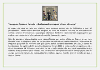 O documento fornece instruções sobre o que fazer em caso de ficar preso em um elevador, como acionar a segurança e os bombeiros, manter a calma até o resgate, e não tentar abrir as portas ou interferir no equipamento. Também ressalta a importância da manutenção periódica para evitar acidentes.