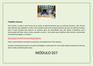O documento discute os riscos de se trabalhar à noite, quando crimes e atos ilícitos são mais comuns, e dá conselhos para os vigilantes noturnos se protegerem, como evitar dormir durante o turno, permanecer em locais estratégicos que permitam ampla visão e fazer rondas constantes nas áreas.