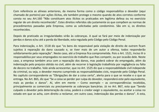O documento discute as responsabilidades legais dos porteiros segundo o Código Civil brasileiro. Ele explica que porteiros podem ser responsabilizados por danos causados por visitantes se omitirem certos direitos dos condôminos ou não verificarem informações de visitantes. Também protege porteiros que operam dentro de seus direitos reconhecidos e regulamentos. A empresa também pode ser responsabilizada pelos atos de seus empregados. É importante que porteiros conheçam suas obrigações legais para evitar problemas.