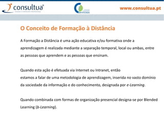O documento discute o conceito de formação a distância e e-learning. Especificamente, define formação a distância como aprendizagem mediada pela separação entre professores e alunos no tempo ou espaço. E-learning refere-se a aprendizagem mediada pela internet ou intranet. O documento também discute características e dimensões de sistemas de e-learning, incluindo a dimensão individual, organizacional e tecnológica.