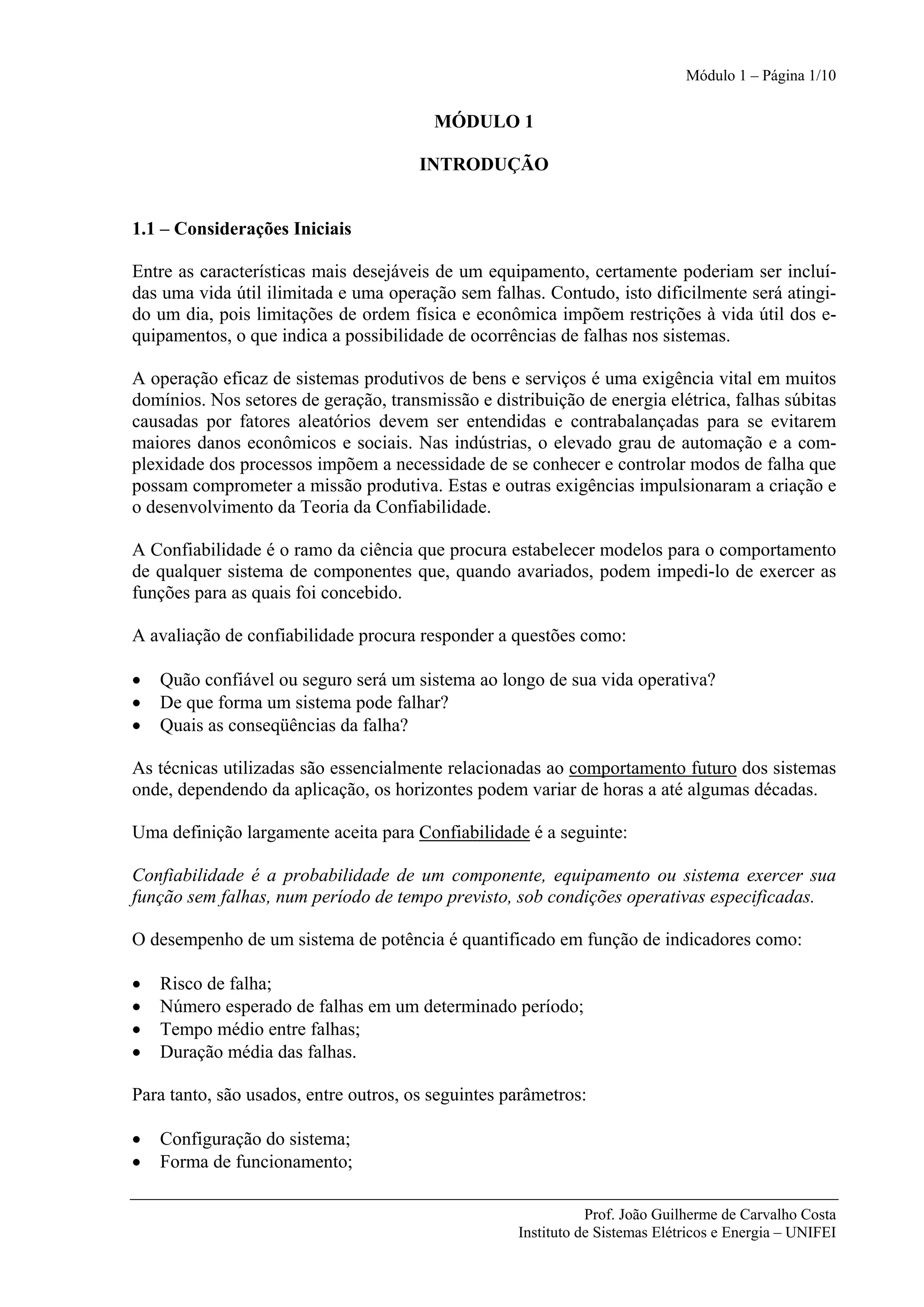 Este documento apresenta conceitos básicos de confiabilidade e probabilidade. Introduz a teoria da confiabilidade como ramo da ciência que estuda o comportamento de sistemas sujeitos a falhas. Define confiabilidade como a probabilidade de um sistema operar sem falhas num período de tempo. Explica conceitos como experimento aleatório, espaço probabilístico, evento, probabilidade, eventos independentes, condicionais e regras para cálculo de probabilidades de ocorrência simultânea ou de pelo menos um evento.