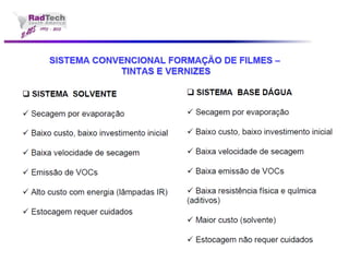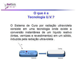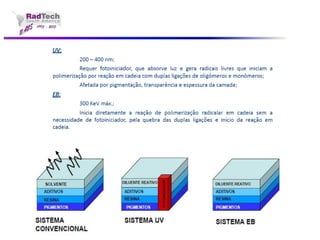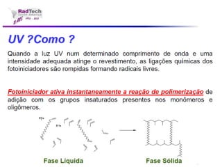 O documento discute a cura por radiação, seu processo e principais aplicações. Apresenta os princípios e mecanismos da cura por radiação UV, como a absorção da luz pelo revestimento e os tipos de lâmpadas. Explora as vantagens da cura por radiação e seus usos em mercados como madeira, vernizes, tintas de impressão, plásticos e novos mercados.