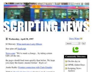 O documento explora a evolução dos blogs e sua relação com o jornalismo e as redes sociais, destacando a transformação da blogosfera desde 1997 até hoje. Aborda a distinção entre diferentes tipos de webjornalismo e os modelos de produção de blogs jornalísticos, além de mencionar o uso de blogs como ferramenta pedagógica na educação. Também discute a transição de mídias impressas para plataformas digitais e o impacto das tecnologias emergentes.