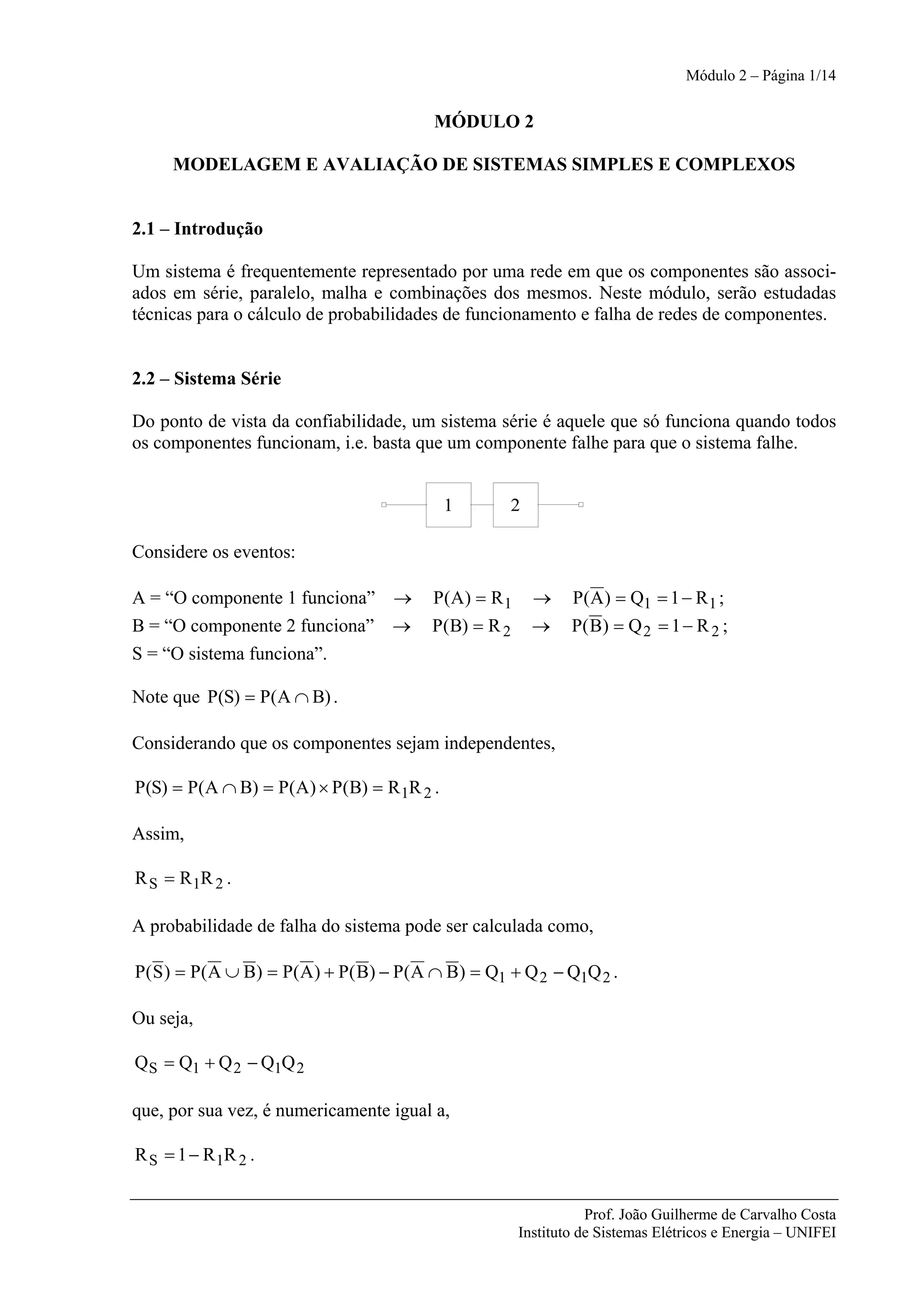 Este documento apresenta técnicas para modelagem e avaliação da confiabilidade de sistemas simples e complexos. Inicialmente, são apresentados modelos para sistemas em série, paralelo e série-paralelo, definindo-se expressões para o cálculo da probabilidade de funcionamento e falha. Posteriormente, são discutidos sistemas parcialmente redundantes e complexos, propondo-se o uso de probabilidade condicional e método dos cortes mínimos para análise destes sistemas.