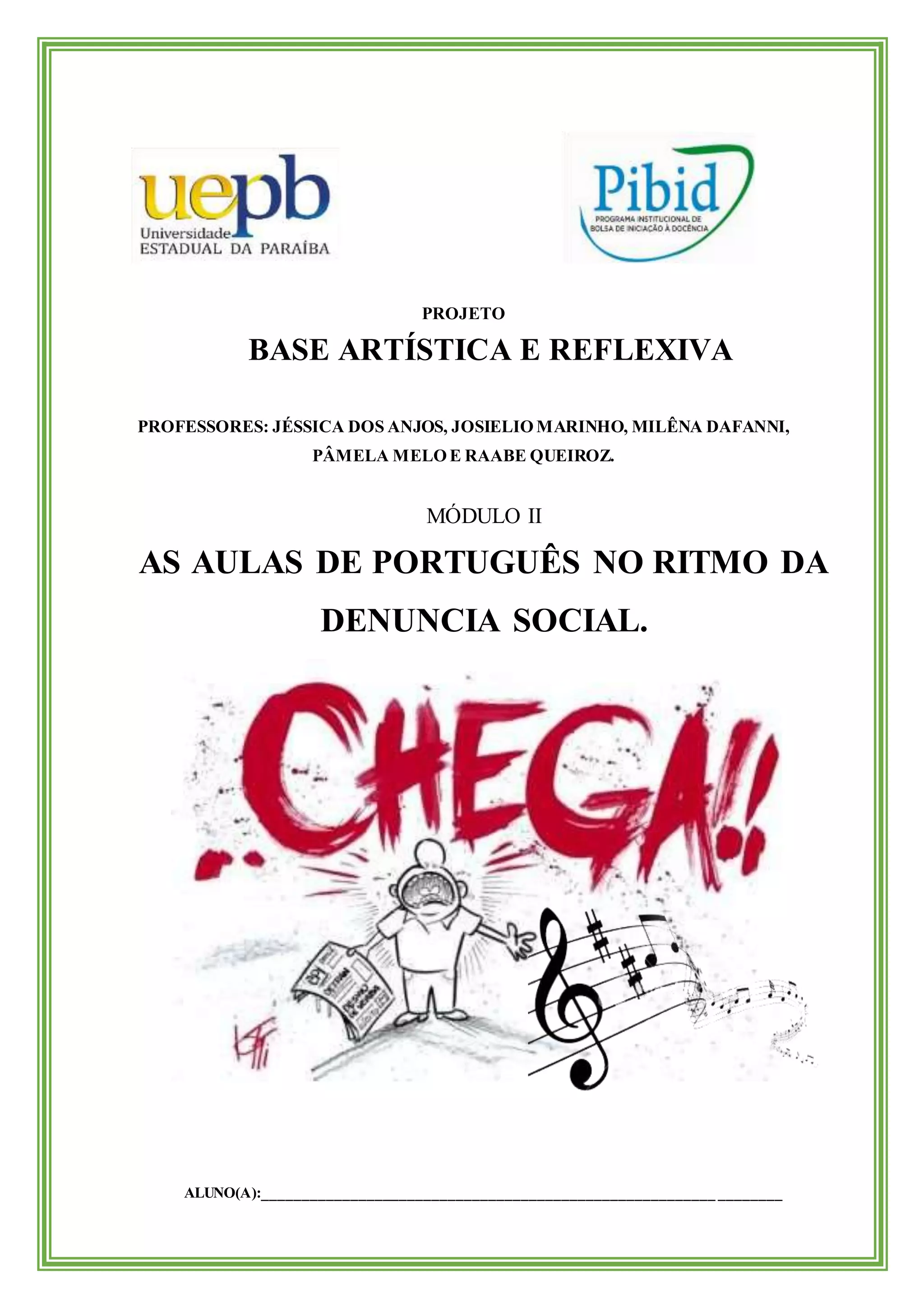 O documento descreve um projeto de professores de português que tem como objetivo utilizar músicas e textos para promover discussões sobre denúncias sociais em aulas de português. O projeto conta com contatos em sites e redes sociais e apresenta letras de músicas e poemas para serem analisados.