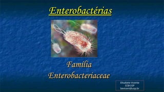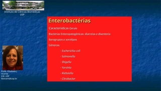 Este documento aborda as enterobactérias da família Enterobacteriaceae, destacando suas características gerais, patogenicidade e os principais gêneros envolvidos em diarreias e disenterias. As bactérias, como Escherichia coli, Salmonella e Shigella, são descritas quanto a sua identificação e os tipos de sorogrupos e sorotipos relevantes para doenças. O texto também explica os mecanismos de ação, transmissão e diagnóstico das infecções causadas por essas bactérias.