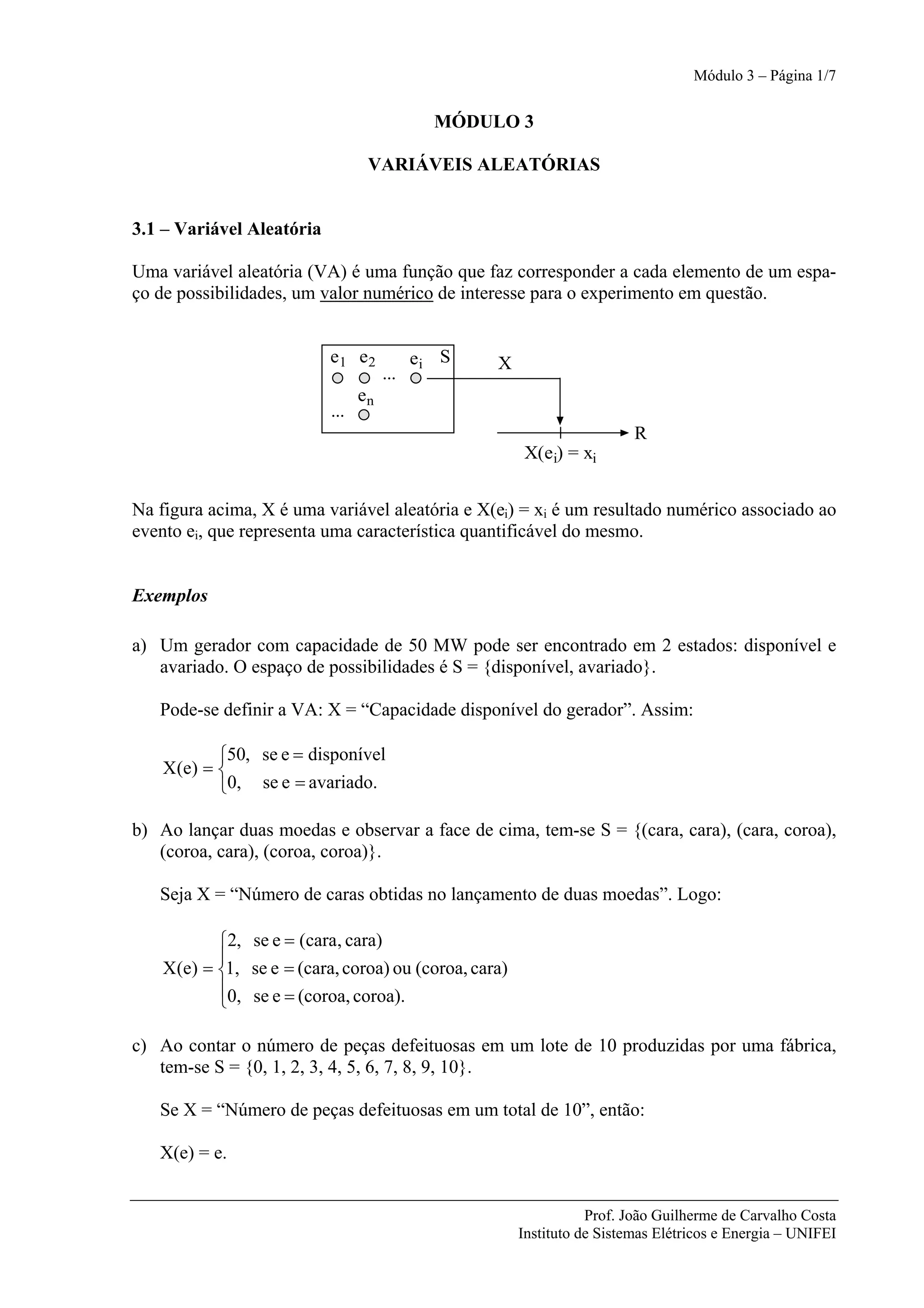 O documento apresenta conceitos básicos sobre variáveis aleatórias, incluindo sua definição, classificação, funções de distribuição e densidade de probabilidade. Exemplos ilustram como modelar variáveis aleatórias em problemas de geração de energia elétrica, e são apresentados parâmetros como esperança matemática e variância para caracterizar as variáveis. Problemas propostos aplicam os conceitos ao cálculo da capacidade estática de sistemas de geração.